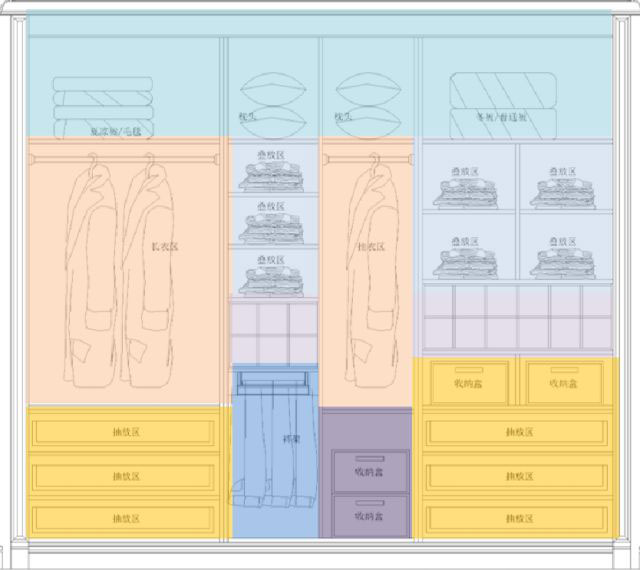 襯衣放置在抽屜或者隔板,以免皺褶變形;毛衣疊放在較深的抽屜里;內衣、領帶等小物應采用專門的收納格;褲子采用專門的褲架晾放。